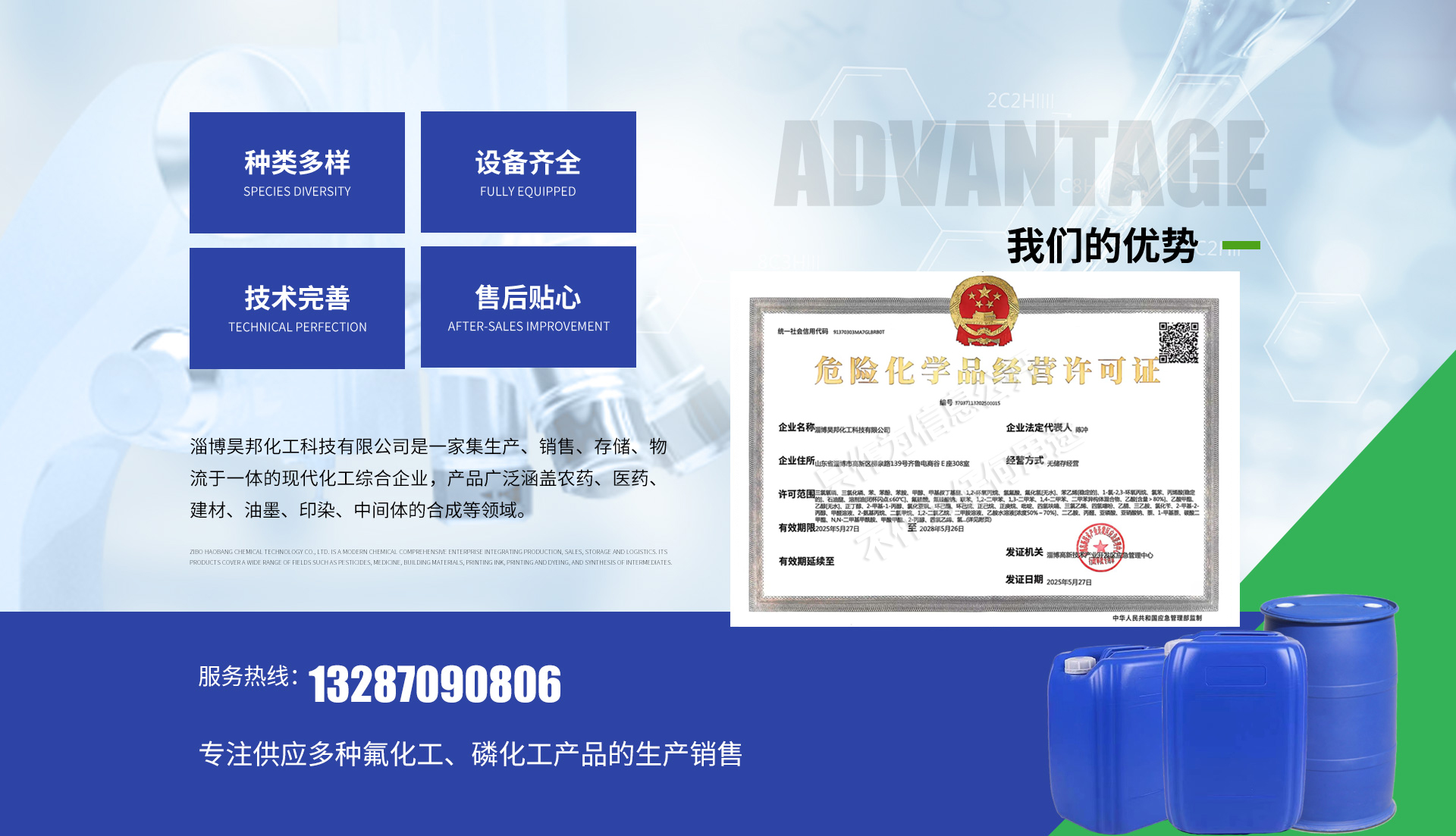 淄博昊邦化工科技有限公司成立于2022年,是一家集生产、销售、存储、物流于一体的现代化工综合企业,坐落在山东淄博高新区产业园。我司生产销售的产品广泛涵盖农药、医药、建材、油墨、印染、中间体的合成等领域,企业坚持走环保路线,无论是生产还是运输过程中均对环境友好,无三废产生。积极响应号召,走环保友好型生产之路,努力打造健康环保的技术型产业。